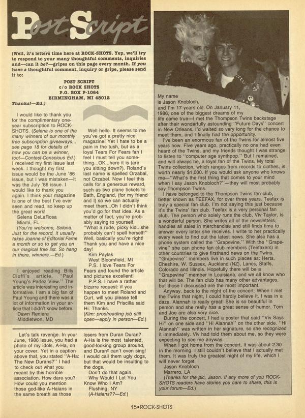 I would like to thank you for the complimentary oneyear subscription to ROCK-SHOTS. (Selena is one of the many winners of our monthly free subscription giveaways... see page 18 for details of how you can be a winner, too!—Contest-Conscious Ed.)
