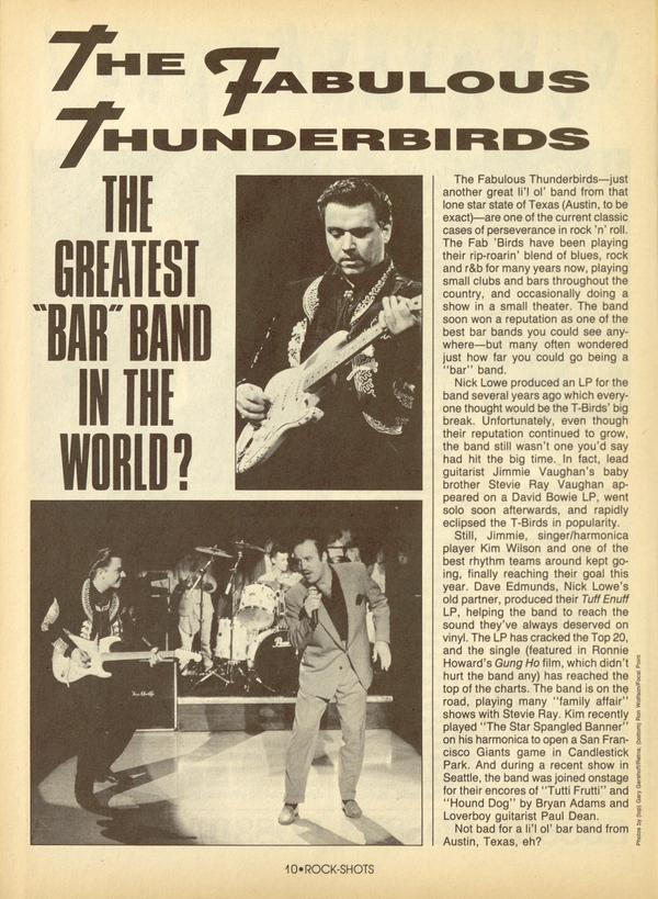 The Fabulous Thunderbirds—just another great li’l ol' band from that lone star state of Texas (Austin, to be exact)—are one of the current classic cases of perseverance in rock ’n’ roll. The Fab ’Birds have been playing their rip-roarin’ blend of blues, rock and r&b for many years now, playing small clubs and bars throughout the country, and occasionally doing a show in a small theater.