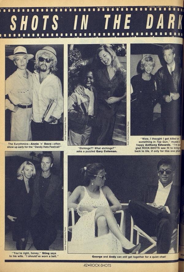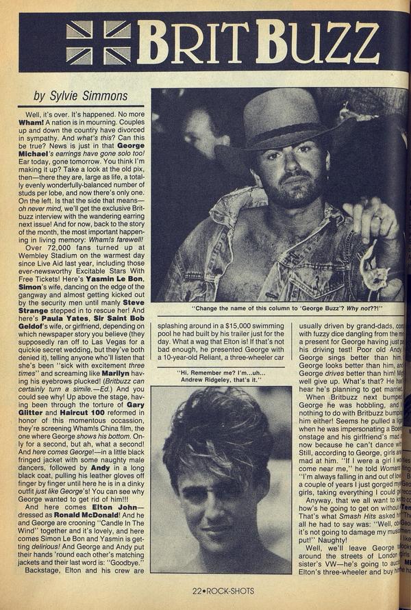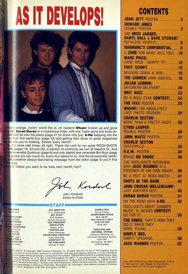 What a strange, rockin’ world this is, oh readers! Wham! broken up and gone (page 26), Duran Duran in a mysterious limbo, with one Taylor gone and Andy doing solo stuff all over the place (page 51 for some nifty pix). A-Ha stepping into the void on their first world tour (page 52) and getting their faces on great magazines like the one you’re holding.