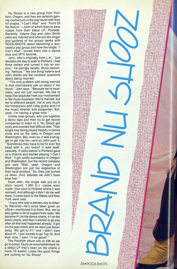 Nu Shooz is a new group from Portland, Oregon, and they are certainly gaining momentum in the pop world with their hit singles “I Can’t Wait” and “Point Of No Return”—both of which feature zany videos from their debut LP, Poolside. Recently, Valerie Day and John Smith (who are married and who are the singer and guitarist of the group) spoke with ROCK-SHOTS about becoming a successful pop group and how the single “I Can’t Wait” turned them into a dance club and MTV favorite.