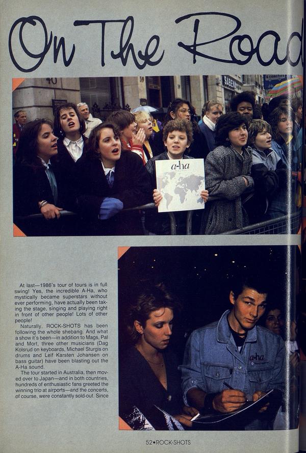 At last— 1986’s tour of tours is in full swing! Yes, the incredible A-Ha, who mystically became superstars without ever performing, have actually been taking the stage, singing and playing right in front of other people! Lots of other people!