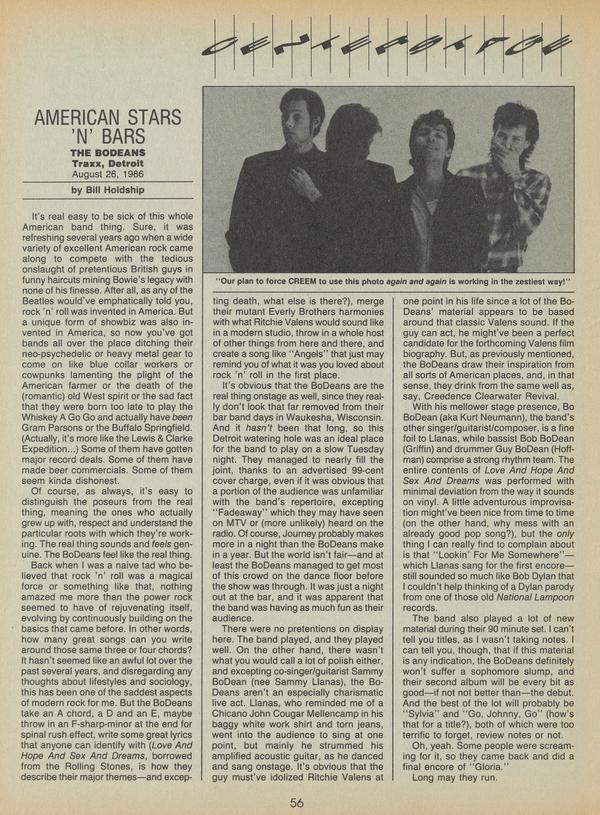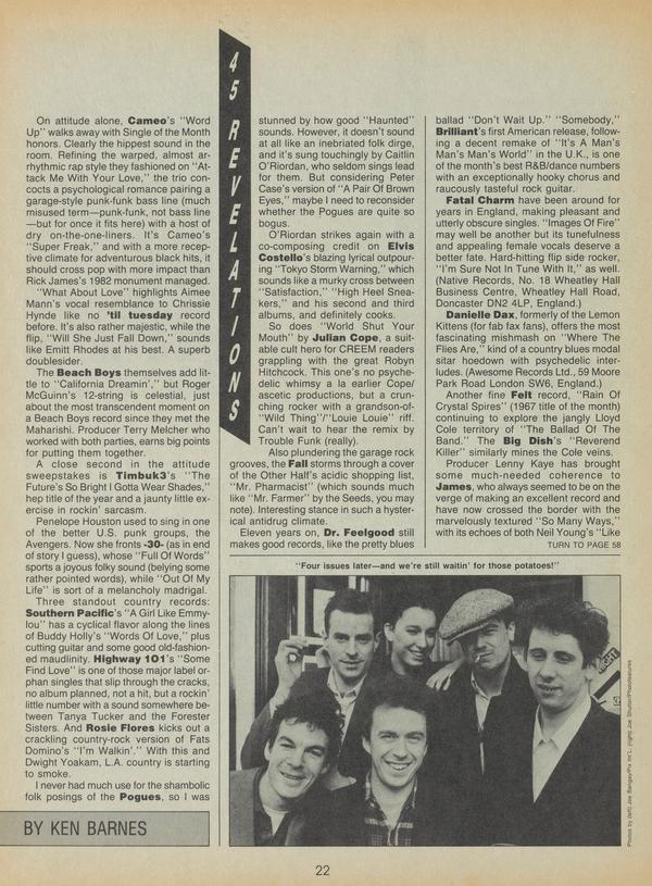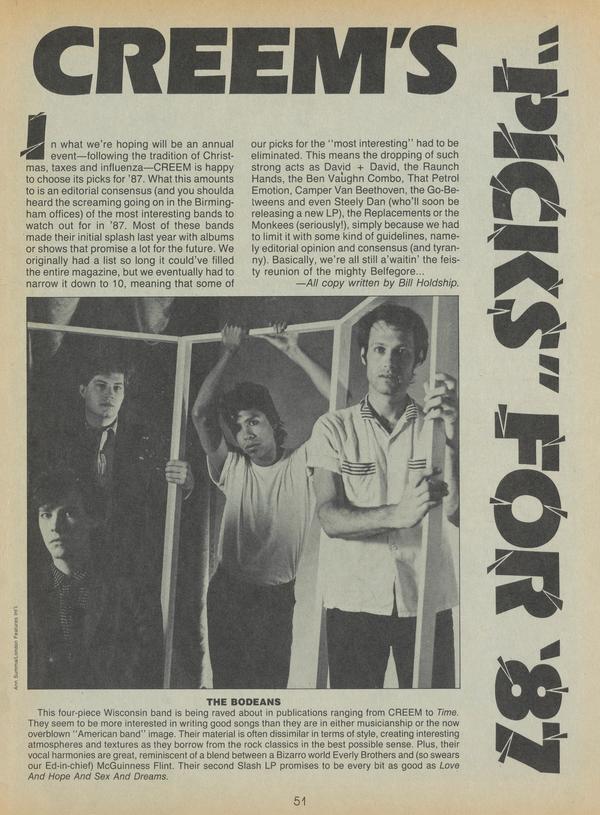 In what we’re hoping will be an annual event—following the tradition of Christmas, taxes and influenza—CREEM is happy to choose its picks for ’87. What this amounts to is an editorial consensus (and you shoulda heard the screaming going on in the Birmingham offices) of the most interesting bands to watch out for in ’87.