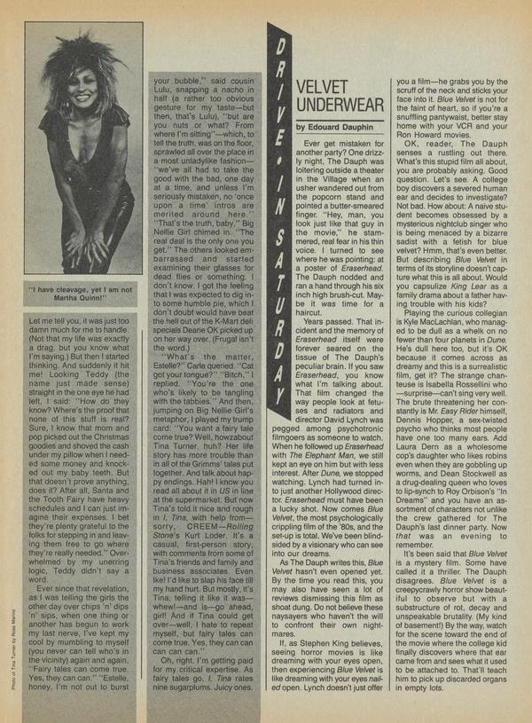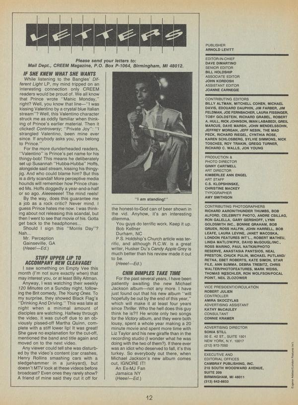 IF SHF KNEW WHAT SHE WANTS While listening to the Bangles’ Different Light LP, my mind tripped on an interesting connection only CREEM readers would be proud of. We all know that Prince wrote “Manic Monday,” right? Well, you know that line—“I was kissing Valentino by a crystal blue Italian stream”? Well, this Valentino character struck me as oddly familiar when thinking of Prince’s earlier material.