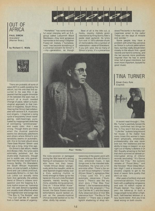 There are probably all sorts of ways (50?) to justify avoiding this album, but the one that first occurred to me was this: it appeared that the yuppie chronicler of life between the wars had, in pursuit of a much needed change of pace, taken a musicological approach to that trendiest of tragedies, South Africa.