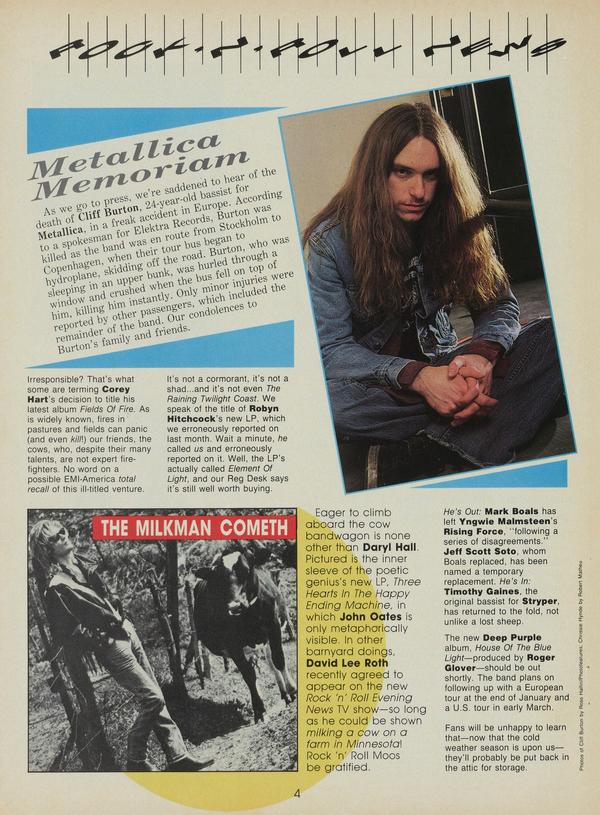 Metallica Memoriam As we go to press, we’re saddened to hear of the death of Cliff Burton, 24-year-old bassist for Metallica, in a freak accident in Europe. According to a spokesman for Elektra Records, Burton was killed as the hand was en route from Stockholm to Copenhagen, when their tour bus began to hydroplane, skidding off the road.