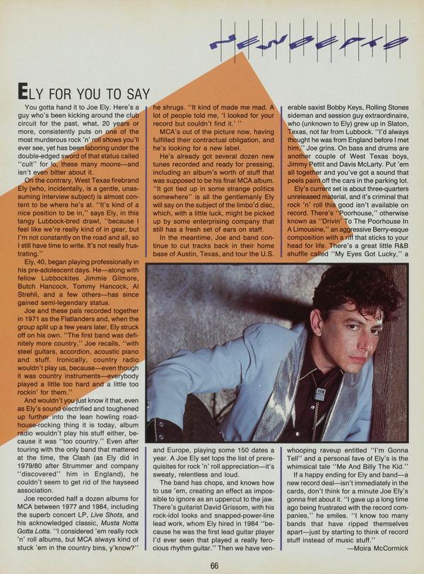 ELY FOR YOU TO SAY You gotta hand it to Joe Ely. Here’s a guy who’s been kicking around the club circuit for the past, what, 20 years or more, consistently puts on one of the most murderous rock ’n’ roll shows you’ll ever see, yet has been laboring under the double-edged sword of that status called “cult” for lo these many moons—and isn’t even bitter about it.