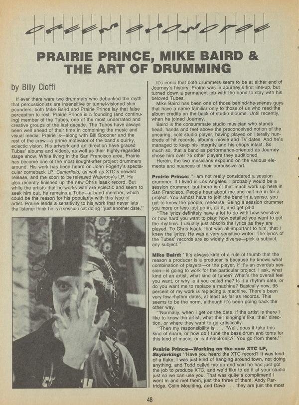If ever there were two drummers who debunked the myth that percussionists are insensitive or tunnel-visioned skin pounders, both Mike Baird and Prairie Prince lay that false perception to rest. Prairie Prince is a founding (and continuing) member of the Tubes, one of the most underrated and creative groups of the last decade.