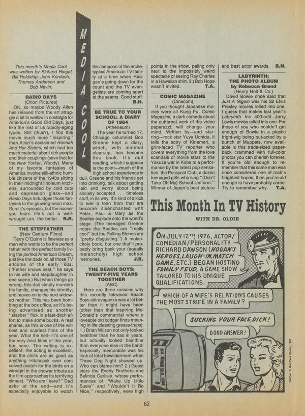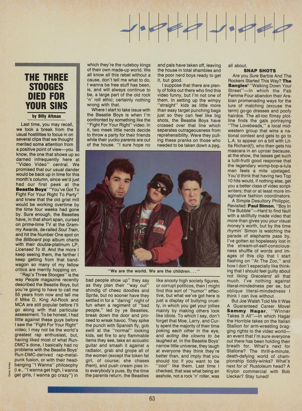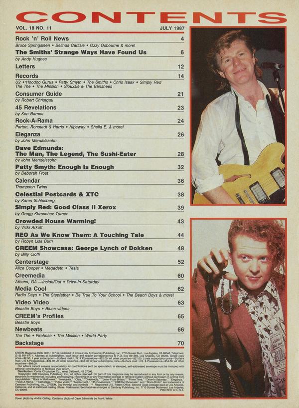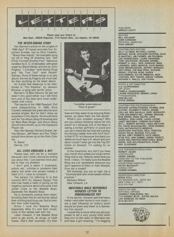 Ken Barnes’s article on the singles of 1986 (April ’87 issue) excludes four important B-sides: two by Elvis Costello, “Brand New Hairdo” (an energetic song cut off of King Of America) and “Get (Find) Yourself Another Fool” (fabulous rendition by E. C. of old ballad, with great organ by Steve Nieve); and two by John Fogerty, “I Confess” (with Bobby King) and “My Toot Toot” (with Rockin’ Sidney).