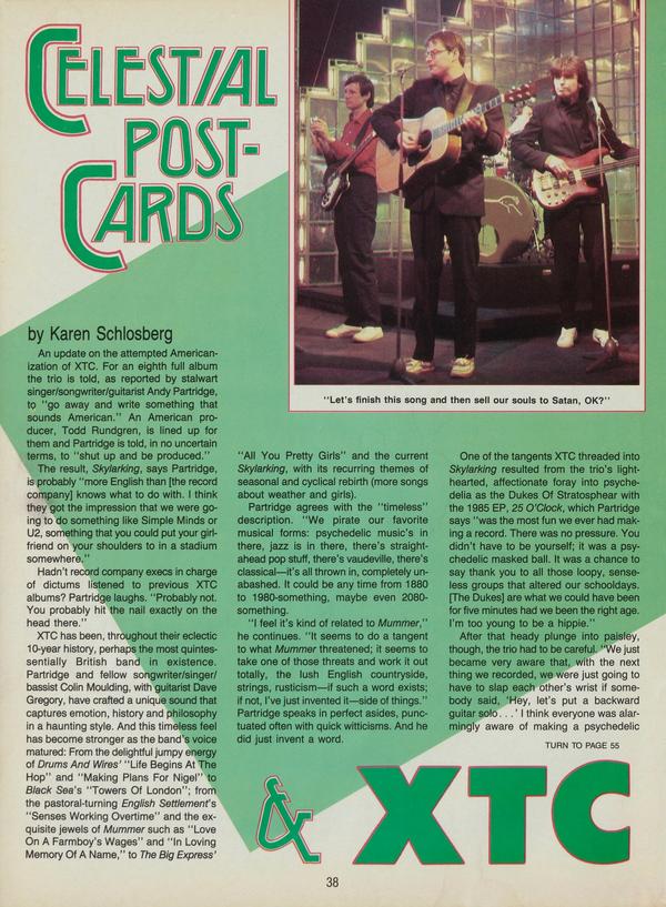 An update on the attempted Americanization of XTC. For an eighth full album the trio is told, as reported by stalwart singer/songwriter/guitarist Andy Partridge, to “go away and write something that sounds American.” An American producer, Todd Rundgren, is lined up for them and Partridge is told, in no uncertain terms, to “shut up and be produced.”