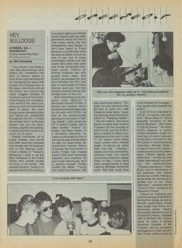 Tony Gayton has made a nifty little documentary with Athens, GA.—Inside/Out. The town of Athens seems to have all the right elements for an interesting film about real people. It's a college town in the deep, rural South with all the history and culture that might suggest (shades of Faulkner!) and all the eccentrics (ranging from the genuinely weird to the utterly pretentious) such environments seem to attract.