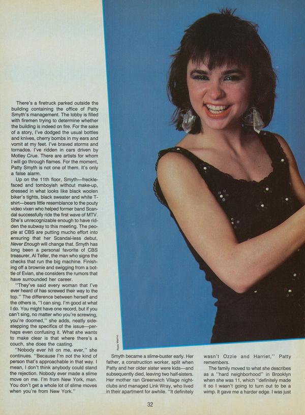 There’s a firetruck parked outside the building containing the office of Patty Smyth’s management. The lobby is filled with firemen trying to determine whether the building is indeed on fire. For the sake of a story, I’ve dodged the usual bottles and knives, cherry bombs in my ears and vomit at my feet.