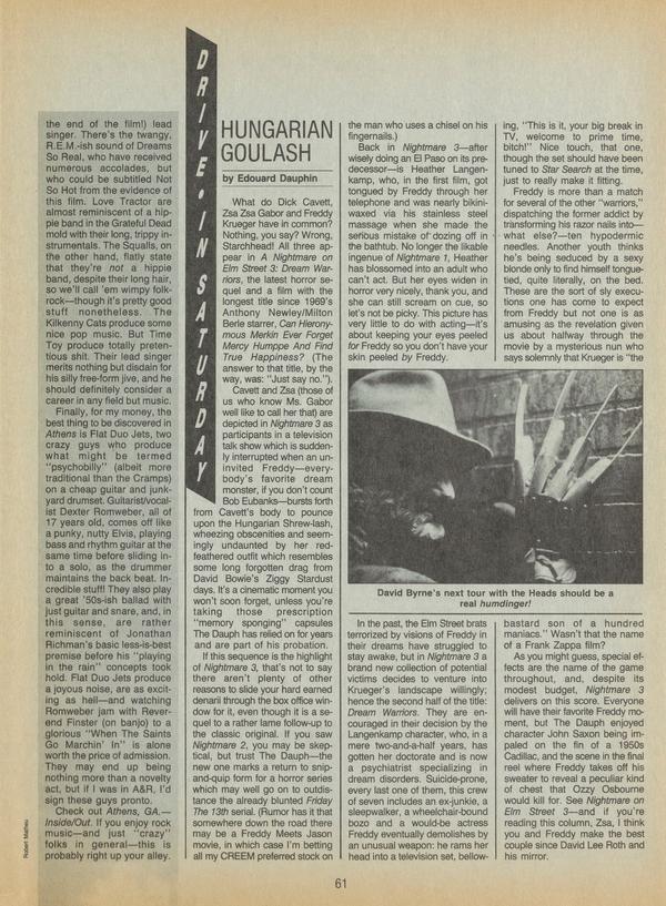 What do Dick Cavett, Zsa Zsa Gabor and Freddy Krueger have in common? Nothing, you say? Wrong, Starchhead! All three appear in A Nightmare on Elm Street 3: Dream Warriors, the latest horror sequel and a film with the longest title since 1969’s Anthony Newley/Milton Berle starrer, Can Hieronymous Merkin Ever Forget Mercy Humppe And Find True Happiness?