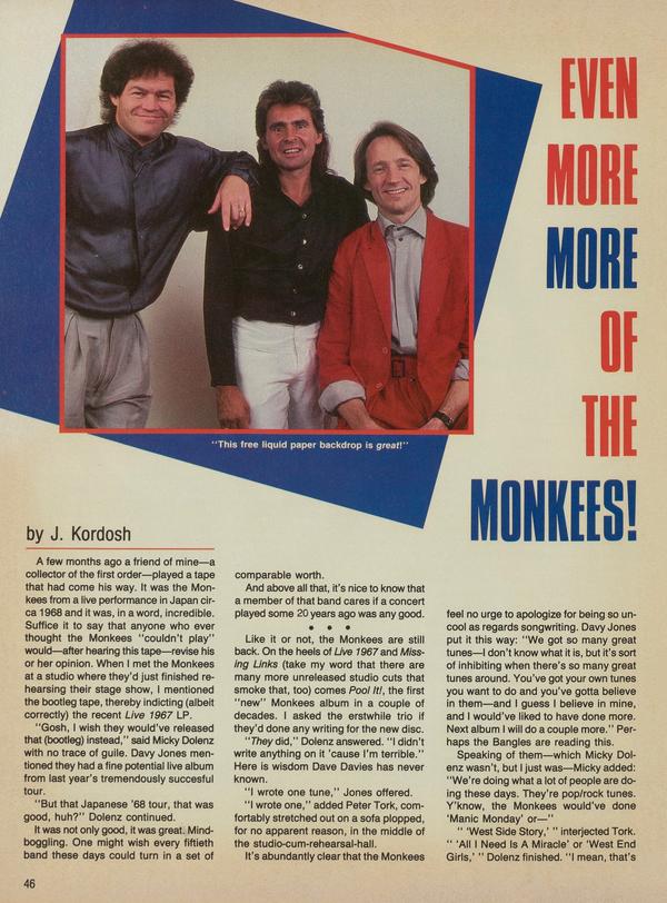 A few months ago a friend of mine—a collector of the first order—played a tape that had come his way. It was the Monkees from a live performance in Japan circa 1968 and it was, in a word, incredible. Suffice it to say that anyone who ever thought the Monkees "couldn’t play” would—after hearing this tape—revise his or her opinion.