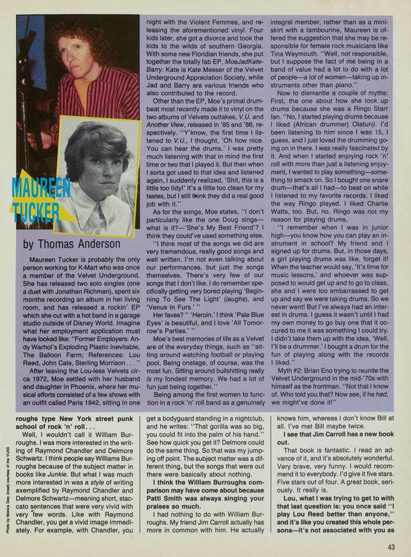 Maureen Tucker is probably the only person working for K-Mart who was once a member of the Velvet Underground. She has released two solo singles (one a duet with Jonathan Richman), spent six months recording an album in her living room, and has released a rockin’ EP which she cut with a hot band in a garage studio outside of Disney World, imagine what her employment application must have looked like: