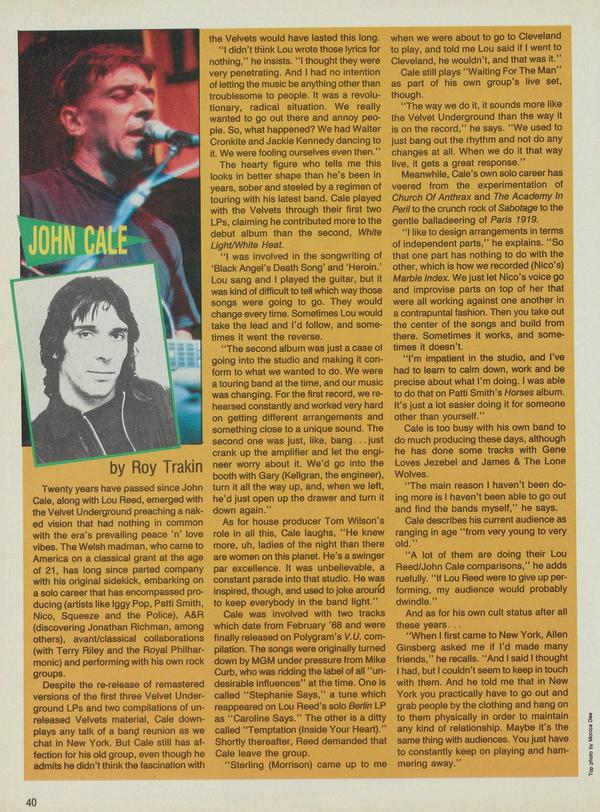 Twenty years have passed since John Cale, along with Lou Reed, emerged with the Velvet Underground preaching a naked vision that had nothing in common with the era’s prevailing peace ’n’ love vibes. The Welsh madman, who came to America on a classical grant at the age of 21, has long since parted company with his original sidekick, embarking on a solo career that has encompassed producing (artists like Iggy Pop, Patti Smith, Nico, Squeeze and the Police), A&R (discovering Jonathan Richman, among others), avant/classical collaborations (with Terry Riley and the Royal Philharmonic) and performing with his own rock groups.