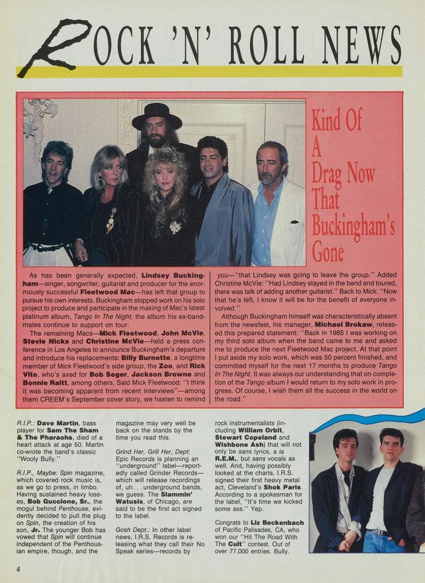As has been generally expected, Lindsey Buckingham—singer; songwriter, guitarist and producer for the enormously successful Fleetwood Mac-—has left that group to pursue his own interests. Buckingham stopped work on his solo project to produce and participate in the making of Mac’s latest platinum album, Tango In The Night, the album his ex-bandmates continue to support on tour.