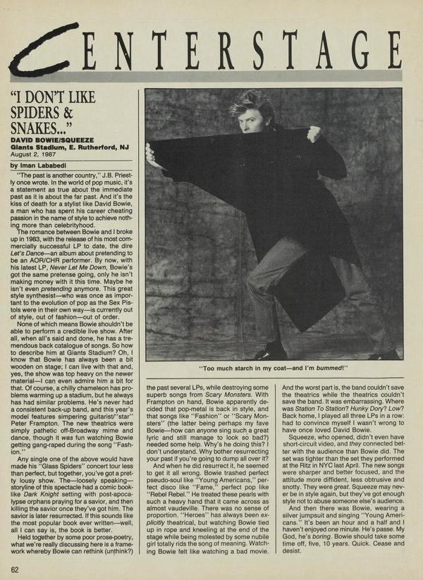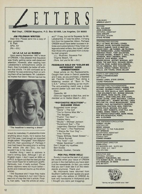Dear Sirs: Please send me a copy of your guidelines. B. Platt APO, NY (No.—Ed.) LA LA LA LA LA BAMBA! Upon seeing September 1987’s issue of CREEM, I was pleased that Squeeze was finally getting some well-deserved attention. However, after reading Ivan Lababamba’s schizophrenic article on them, they’d probably be better off without that article.