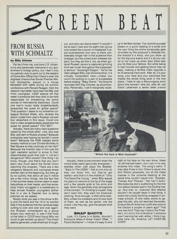 Far be it from me, one lone U.S. citizen, to try and personally intervene in our government’s foreign policy, but I feel it only my patriotic duty to point out to the leaders of Home Box Office that if there’s even the slightest chance that Soviet Premier Mikhail Gorbachev staved in a house equipped with cable during his summit conference with Ronald Reagan, then the network had better have kept the Billy Joel From Leningrad, USSR special off that week’s schedule lest they wish to be held responsible for threatening the entire course of international diplomacy.