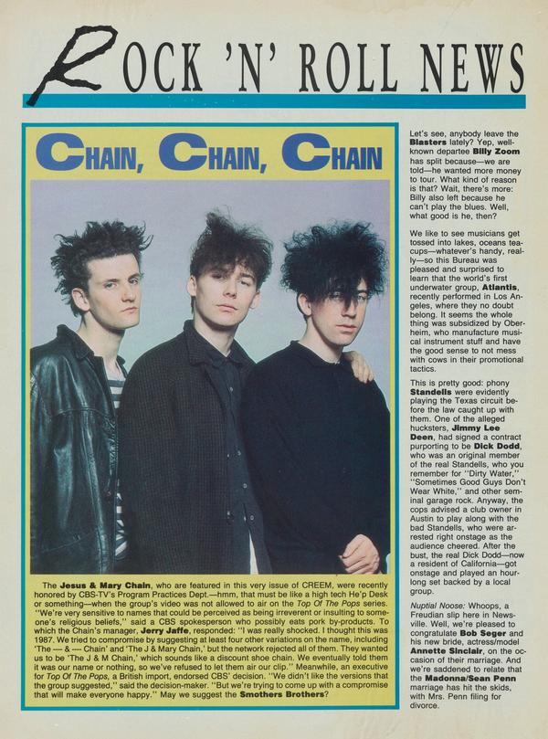 The Jesus & Mary Chain, who are featured in this very issue of CREEM, were recently honored by CBS-TV’s Program Practices Dept.—hmm, that must be like a high tech He’p Desk or something—when the group’s video was not allowed to air on the Top Of The Pops series.