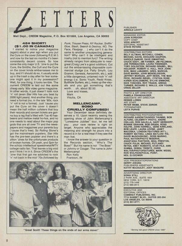 I started to notice your magazine (again) about a year ago when you put the Cure on the cover (following R.E.M.!) and now for the last six months it’s been consistently decent covers. So how come the only major U.S. ’zine to put the Cure, the Smiths, the Cult and the Cure on the cover kinda embarrasses me to buy, and if I should do so, it usually ends up in the trash a day after for fear someone might spot it in my possession?