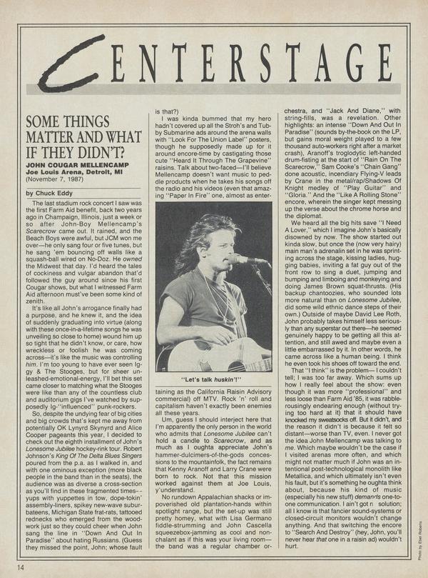 The last stadium rock concert I saw was the first Farm Aid benefit, back two years ago in Champaign, Illinois, just a week or so after John-Boy Mellencamp’s Scarecrow came out. It rained, and the Beach Boys were awful, but JCM won me over—he only sang four or five tunes, but he sang ’em bouncing off walls like a squash-ball wired on No-Doz.
