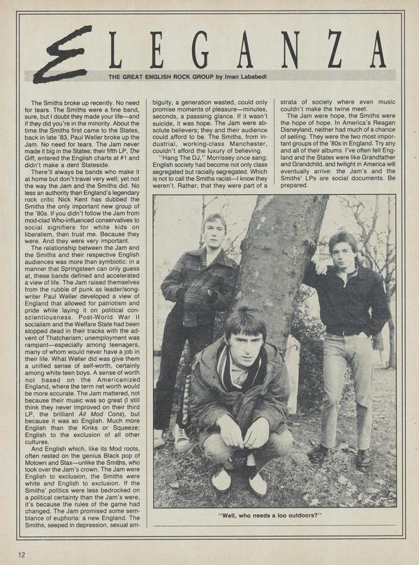 The Smiths broke up recently. No need for tears. The Smiths were a fine band, sure, but I doubt they made your life—and if they did you’re in the minority. About the time the Smiths first came to the States, back in late ’83, Paul Weller broke up the Jam.