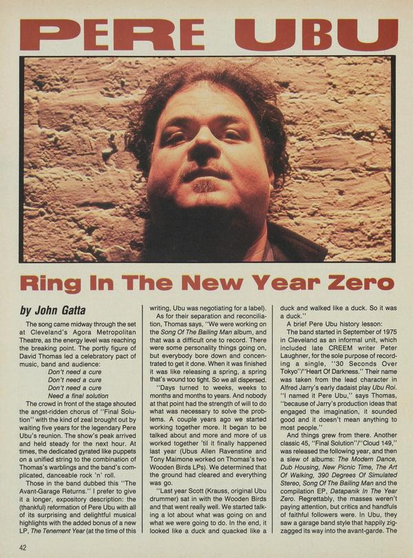 The song came midway through the set at Cleveland’s Agora Metropolitan Theatre, as the energy level was reaching the breaking point. The portly figure of David Thomas led a celebratory pact of music, band and audience: Don’t need a cure Don’t need a cure Don’t need a cure Need a final solution The crowd in front of the stage shouted the angst-ridden chorus of “Final Solution” with the kind of zeal brought out by waiting five years for the legendary Pere Ubu’s reunion.