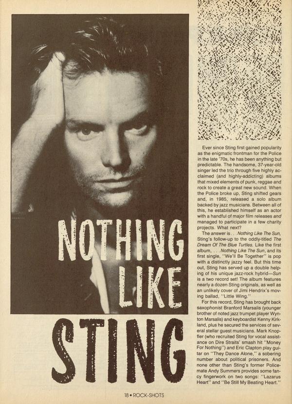 Ever since Sting first gained popularity as the enigmatic frontman for the Police in the late 70s, he has been anything but predictable. The handsome, 37-year-old singer led the trio through five highly acclaimed (and highly-addicting) albums that mixed elements of punk, reggae and rock to create a great new sound.