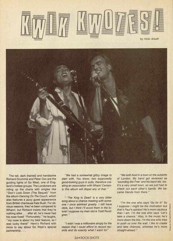 The tall, dark (haired) and handsome Richard Drummie and Peter Cox are the guiding lights of Go West, one of England’s hottest groups. The Londoners are riding up the charts with singles like “Don’t Look Down (The Sequel)” from the album Dancing On The Couch, which also features a jazzy guest appearance from British chanteuse Kate Bush.