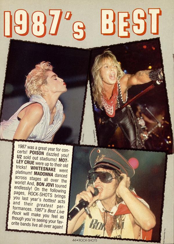 1987 was a great year for concerts! POISON dazzled you! U2 sold out stadiums! MOTLEY CRUE were up to their old tricks! WHITESNAKE went platinum! MADONNA danced across stages all over the endlessly! On the following pages, ROCK-SHOTS, brings you last year's hottest acts and their greatest performances.