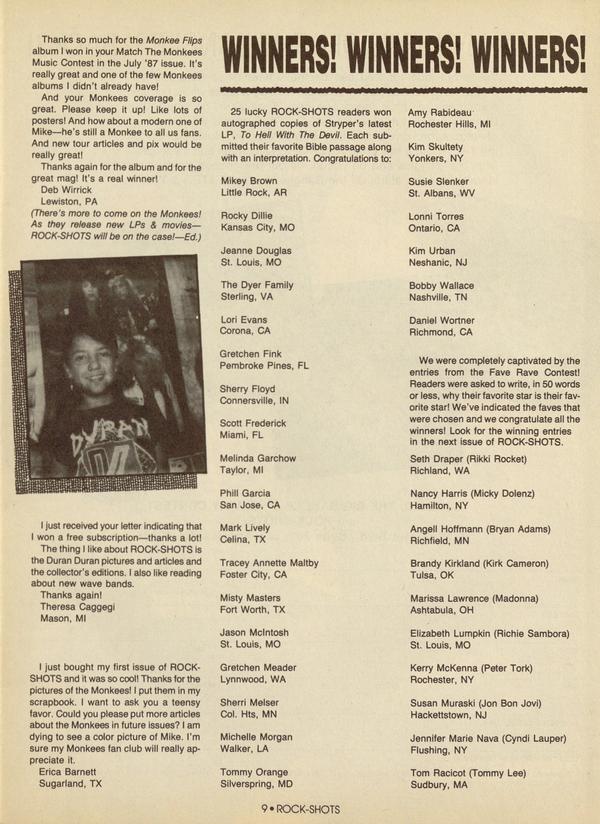 Thanks so much for the Monkee Flips album I won in your Match The Monkees Music Contest in the July ’87 issue. It’s really great and one of the few Monkees albums I didn’t already have! And your Monkees coverage is so great. Please keep it up! Like lots of posters!