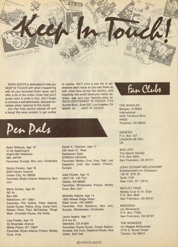 ROCK-SHOTS is dedicated to help you KEEP IN TOUCH! with what’s happening with all your favorites! Each issue, we’ll offer a list of fan clubs—ones that you’ll surely want to write to (but, don’t forget to enclose a self-addressed, stamped envelope when replying to the clubs).
