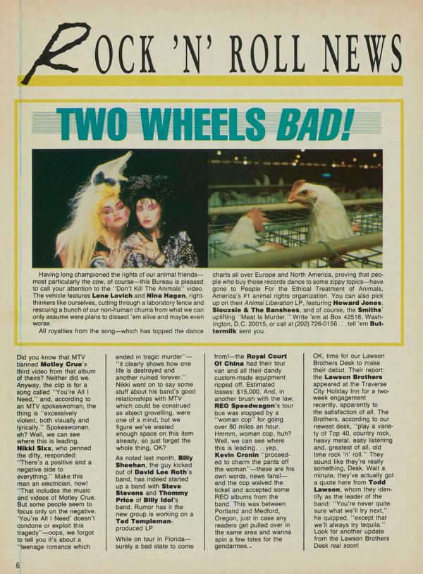 Having long championed the rights of our animal friends— most particularly the cow, of course—this Bureau is pleased to call your attention to the “Don’t Kill The Animals” video. The vehicle features Lene Lovich and Nina Hagen, rightthinkers like ourselves, cutting through a laboratory fence and rescuing a bunch of our non-human chums from what we can only assume were plans to dissect ’em alive and maybe even worse.
