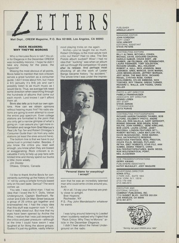 Who is Hercules Bovis to talk? His sitin for Eleganza in the December CREEM was incredibly moronic. I hope he didn’t take any money for the piece, the hypocrite! Missing the most obvious of all points, Bovis failed to mention that rock criticism serves a great function as a consumer guide.
