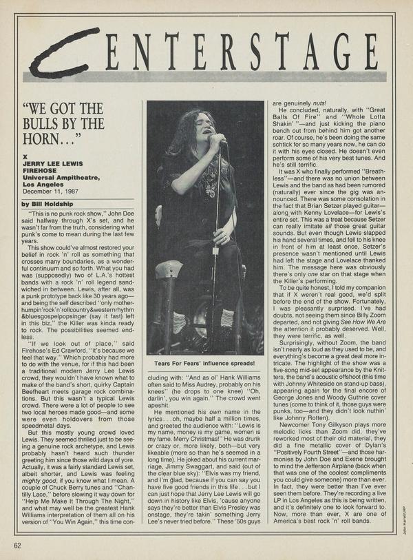 “This is no punk rock show,” John Doe said halfway through X’s set, and he wasn’t far from the truth, considering what punk’s come to mean during the last few years. This show could’ve almost restored your belief in rock ’n’ roll as something that crosses many boundaries, as a wonderful continuum and so forth.
