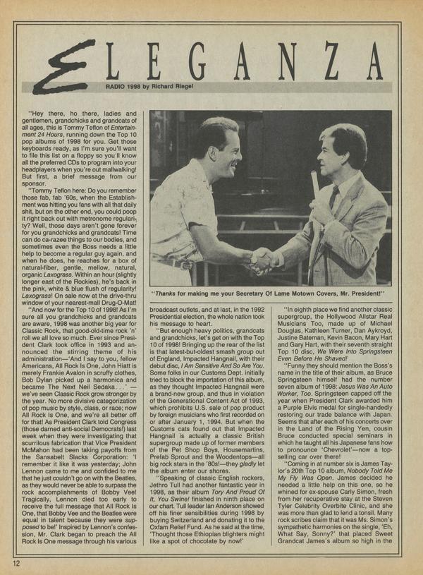 “Hey there, ho there, ladies and gentlemen, grandchicks and grandcats of all ages, this is Tommy Teflon of Entertainment 24 Hours, running down the Top 10 pop albums of 1998 for you. Get those keyboards ready, as I’m sure you’ll want to file this list on a floppy so you'll know all the preferred CDs to program into your headplayers when you’re out mallwalking!