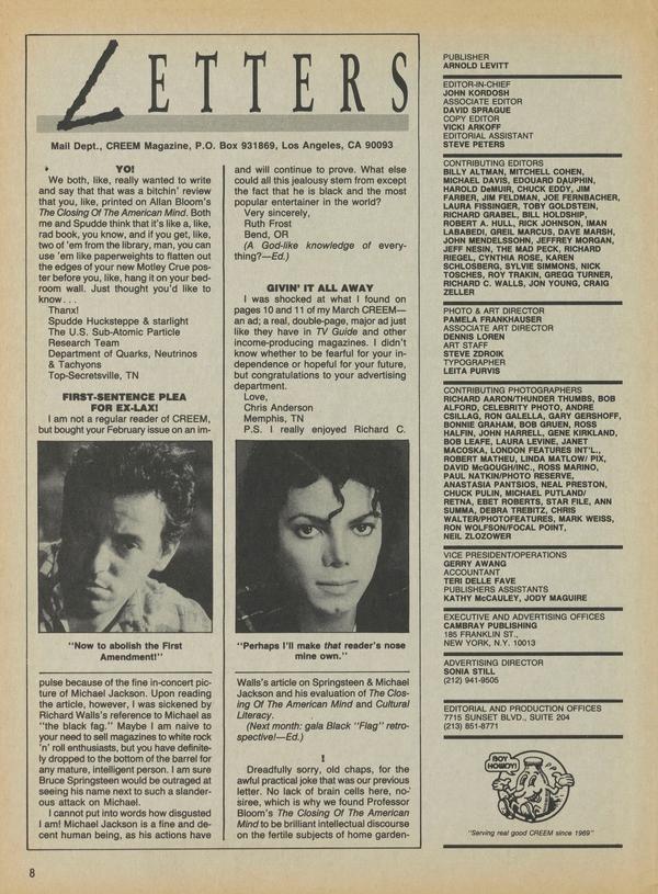 We both, like, really wanted to write and say that that was a bitchin’ review that you, like, printed on Allan Bloom’s The Closing Of The American Mind. Both me and Spudde think that it’s like a, like, rad book, you know, and if you get, like, two of ’em from the library, man, you can use ’em like paperweights to flatten out the edges of your new Motley Crue poster before you, like, hang it on your bedroom wall.