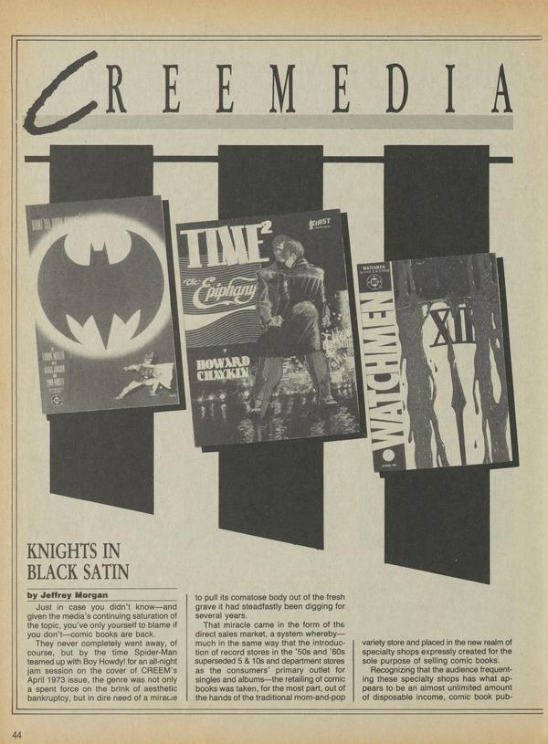 Just in case you didn’t know—and given the media’s continuing saturation of the topic, you’ve only yourself to blame if you don’t—comic books are back. They never completely went away, of course, but by the time Spider-Man teamed up with Boy Howdy! for an all-night jam session on the cover of CREEM’s April 1973 issue, the genre was not only a spent force on the brink of aesthetic bankruptcy, but in dire need of a miracle to pull its comatose body out of the fresh grave it had steadfastly been digging for several years.