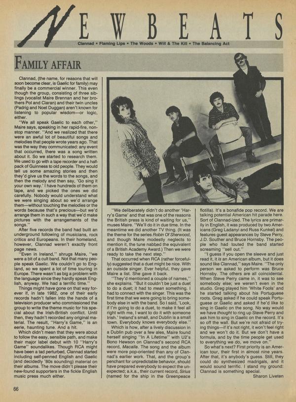 Clannad, (the name, for reasons that will soon become clear, is Gaelic for family) may finally be a commercial winner. This even though the group, consisting of three siblings (vocalist Maire Brennan and her brothers Pol and Ciaran) and their twin uncles (Padrig and Noel Duggan) aren’t known for listening to popular wisdom—or logic, either.