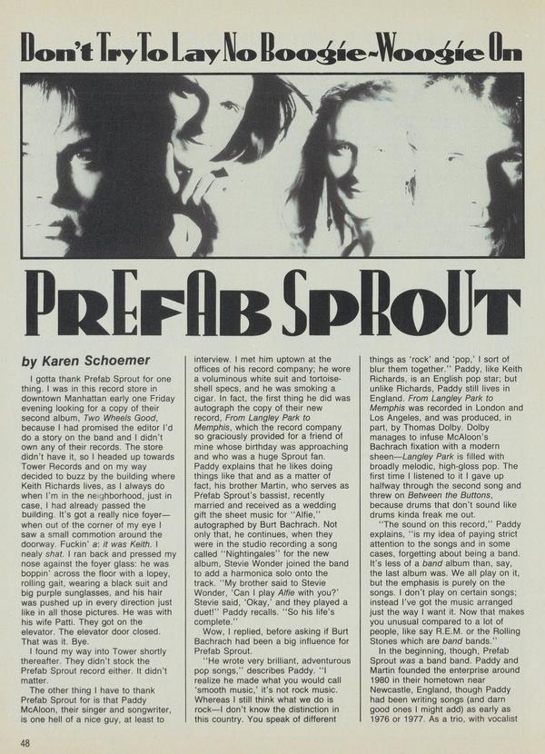 I gotta thank Prefab Sprout for one thing. I was in this record store in downtown Manhattan early one Friday evening looking for a copy of their second album, Two Wheels Good, because I had promised the editor I'd do a story on the band and I didn't own any of their records. The store didn't have it, so I headed up towards Tower Records and on my way decided to buzz by the building where Keith Richards lives, as I always do when I'm in the neighborhood, just in case, I had already passed the building.