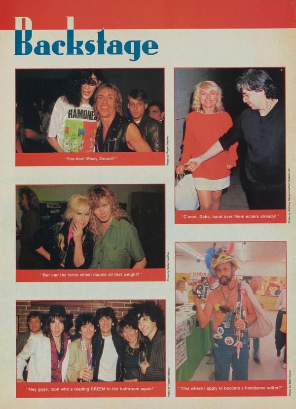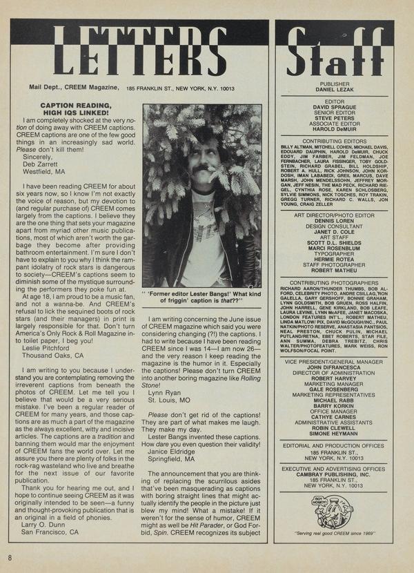 I have been reading CREEM for about six years now, so I know I'm not exactly the voice of reason, but my devotion to (and regular purchase of) CREEM comes largely from the captions. I believe they are the one thing that sets your magazine apart from myriad other music publications, most of which aren't worth the garbage they become after providing bathroom entertainment.