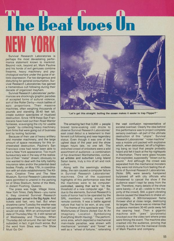 Survival Research Laboratories is perhaps the most devastating performance statement known to mankind. Beyond rock, beyond art, Mark Pauline and his horde of evil geniuses combine firearms, heavy machinery and psychological warfare under the guise of artistic expression.