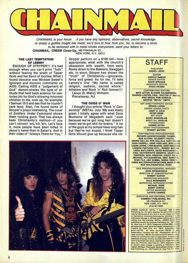 ENOUGH OF STRYPER!!! It’s bad enough when you can’t print “fuck” without fearing the wrath of Tipper Gore and her band of loonies. What I found obscene was Michael Sweet’s ignorant and moronic comments on AIDS. Calling AIDS a “judgement of God” demon-strates the type of attitude that held back science for centuries (As for God’s allowing innocent children to die, look up, for example, I Samuel 15:3 and see that he couldn’t care less).